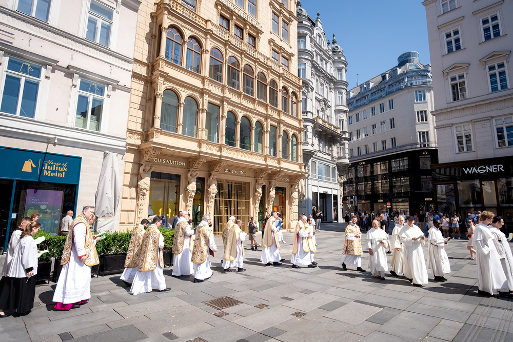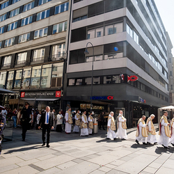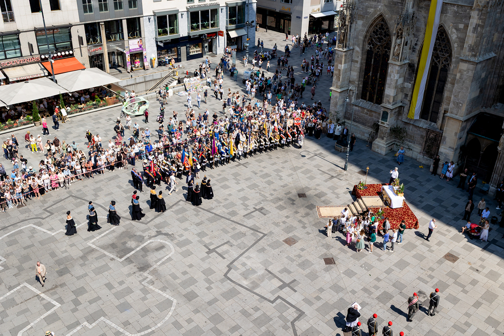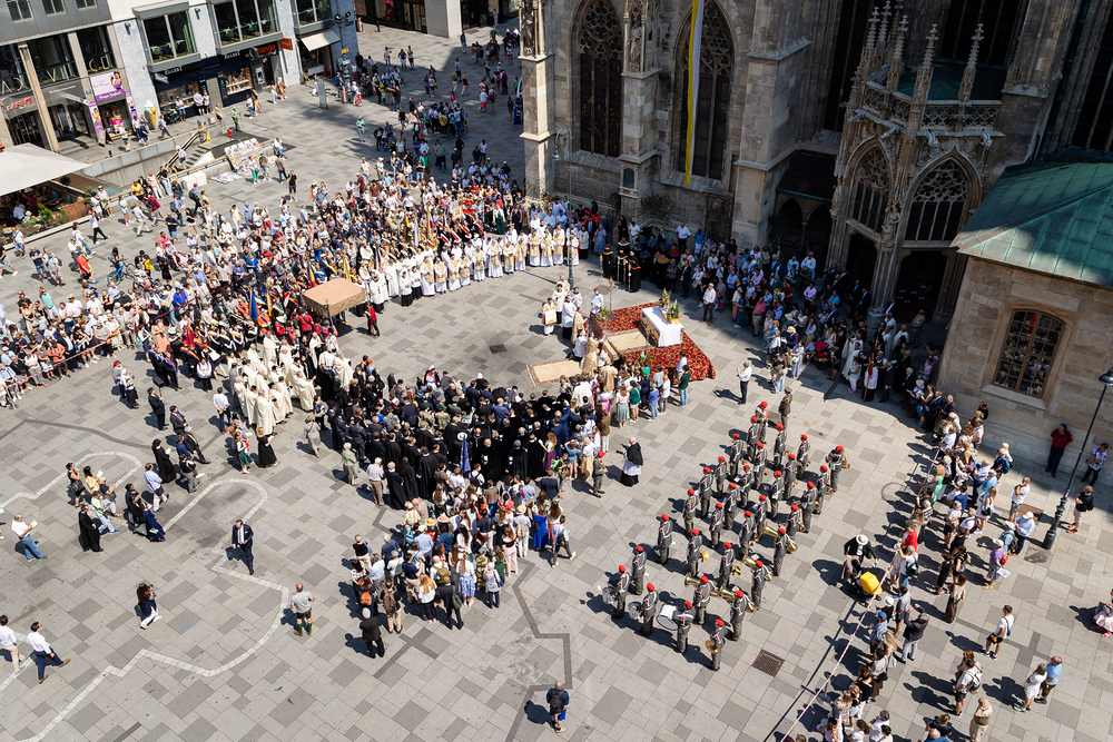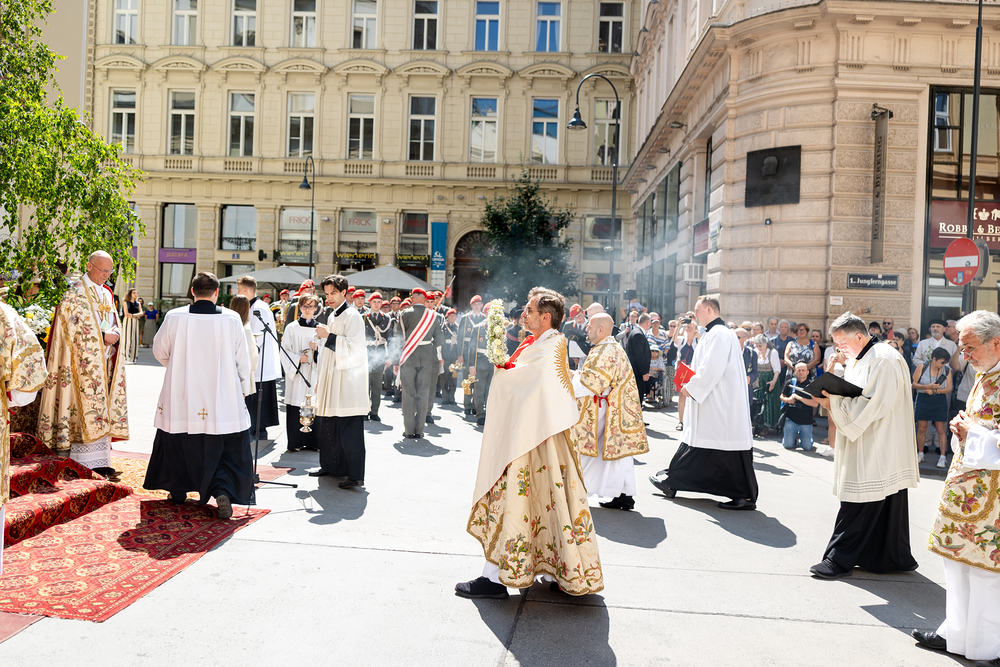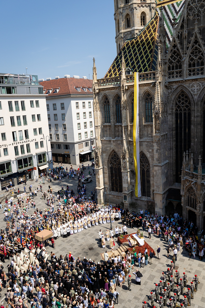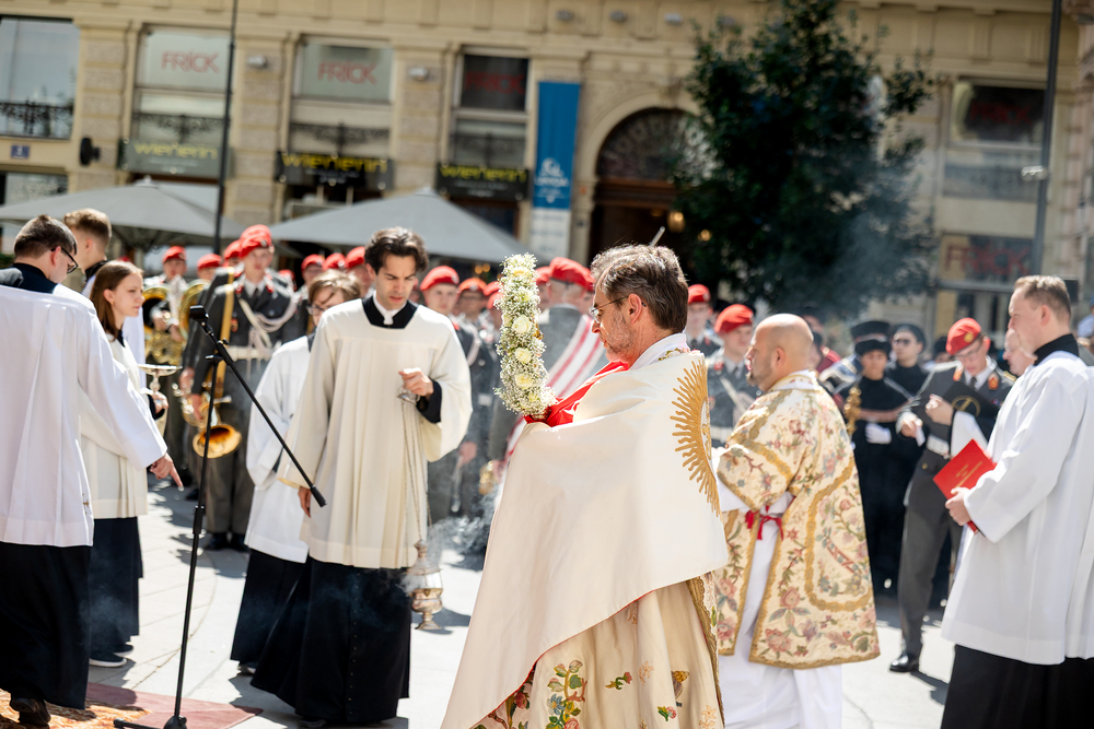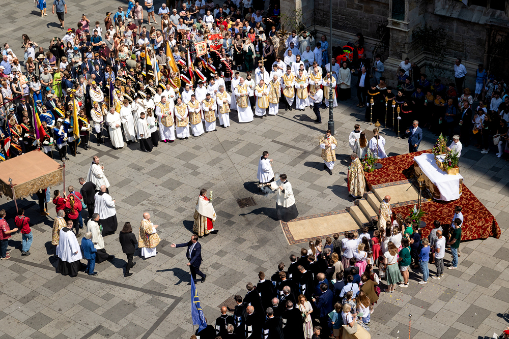 Josef Grünwidl betonte beim Stadtumzug anlässlich Fronleichnam die untrennbare Verbindung zwischen dem religiösen Feiertag und der christlichen Verantwortung, Gottes Schöpfung zu bewahren und eine „ökologische Umkehr“ angesichts der Klimakrise einzuleiten. Er dankte allen, die durch nachhaltiges Handeln und politischen Einsatz dazu beitragen, notwendige Maßnahmen zu ergreifen, um die dramatischen Folgen des Klimawandels abzuwenden. Die Fronleichnamsprozession, die vom Stephansdom ausging und Stationen am Michaelerplatz sowie am Graben bei der Peterskirche umfasste, zog erneut zahlreiche Gläubige und kirchliche Gruppierungen an. Auch politische Vertreter waren anwesend. Wir waren mit der Kamera dabei.