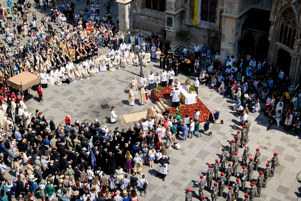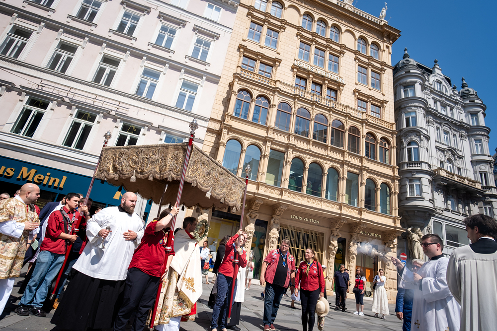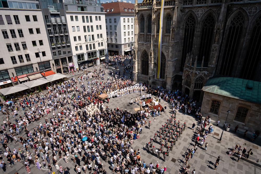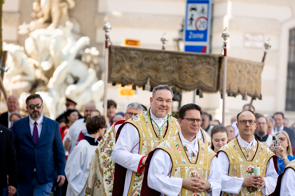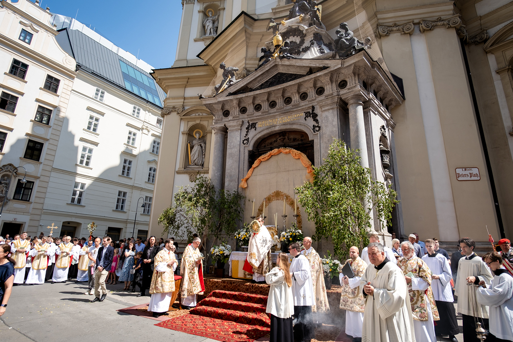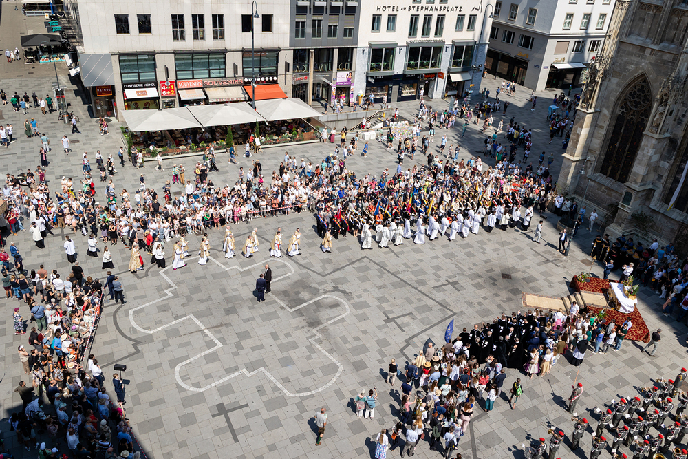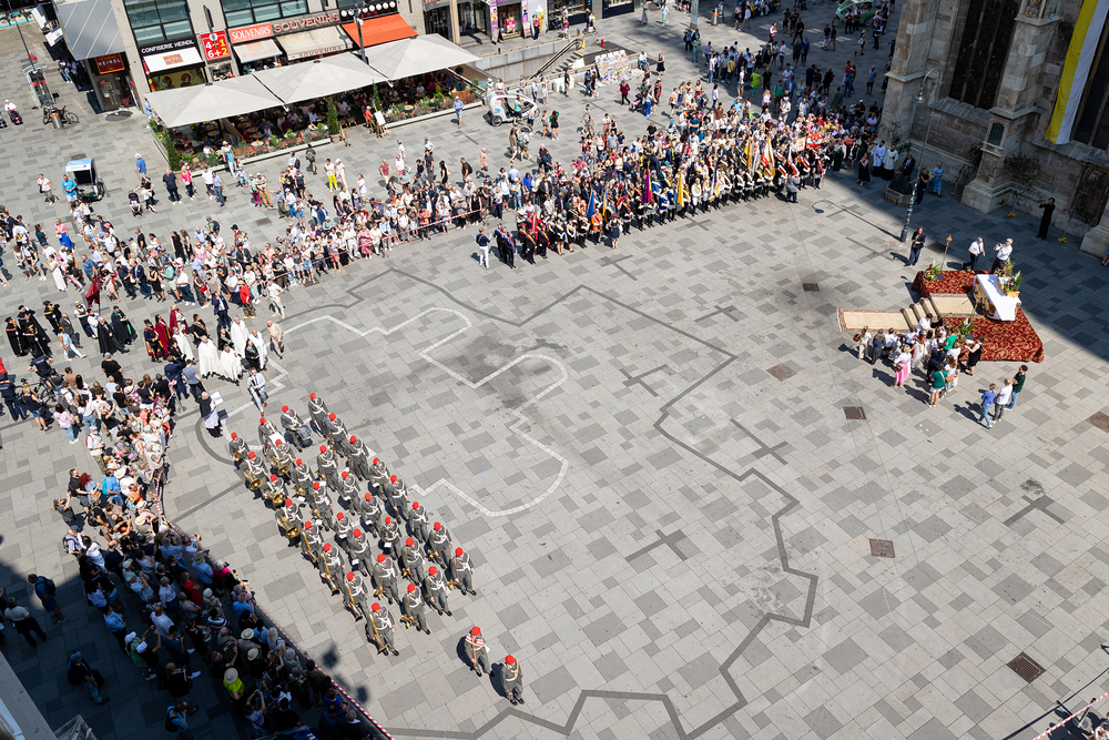 Josef Grünwidl betonte beim Stadtumzug anlässlich Fronleichnam die untrennbare Verbindung zwischen dem religiösen Feiertag und der christlichen Verantwortung, Gottes Schöpfung zu bewahren und eine „ökologische Umkehr“ angesichts der Klimakrise einzuleiten. Er dankte allen, die durch nachhaltiges Handeln und politischen Einsatz dazu beitragen, notwendige Maßnahmen zu ergreifen, um die dramatischen Folgen des Klimawandels abzuwenden. Die Fronleichnamsprozession, die vom Stephansdom ausging und Stationen am Michaelerplatz sowie am Graben bei der Peterskirche umfasste, zog erneut zahlreiche Gläubige und kirchliche Gruppierungen an. Auch politische Vertreter waren anwesend. Wir waren mit der Kamera dabei.